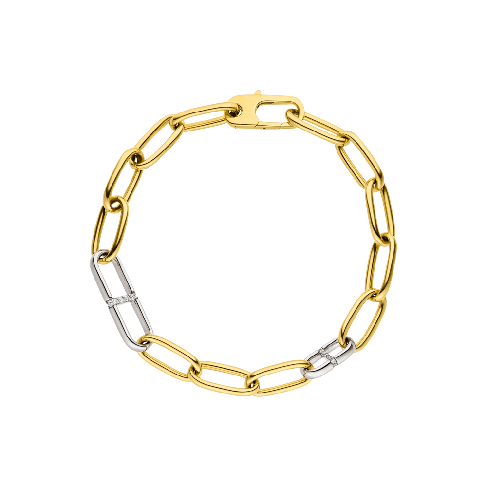 18 karaat geel- witgouden schakelarmband met ovale geelgouden schakels en twee witgouden schakels samen bezet met 24 natuurlijke, briljant geslepen, diamanten samen 0.16 ct. kleur: G zuiverheid: VSI