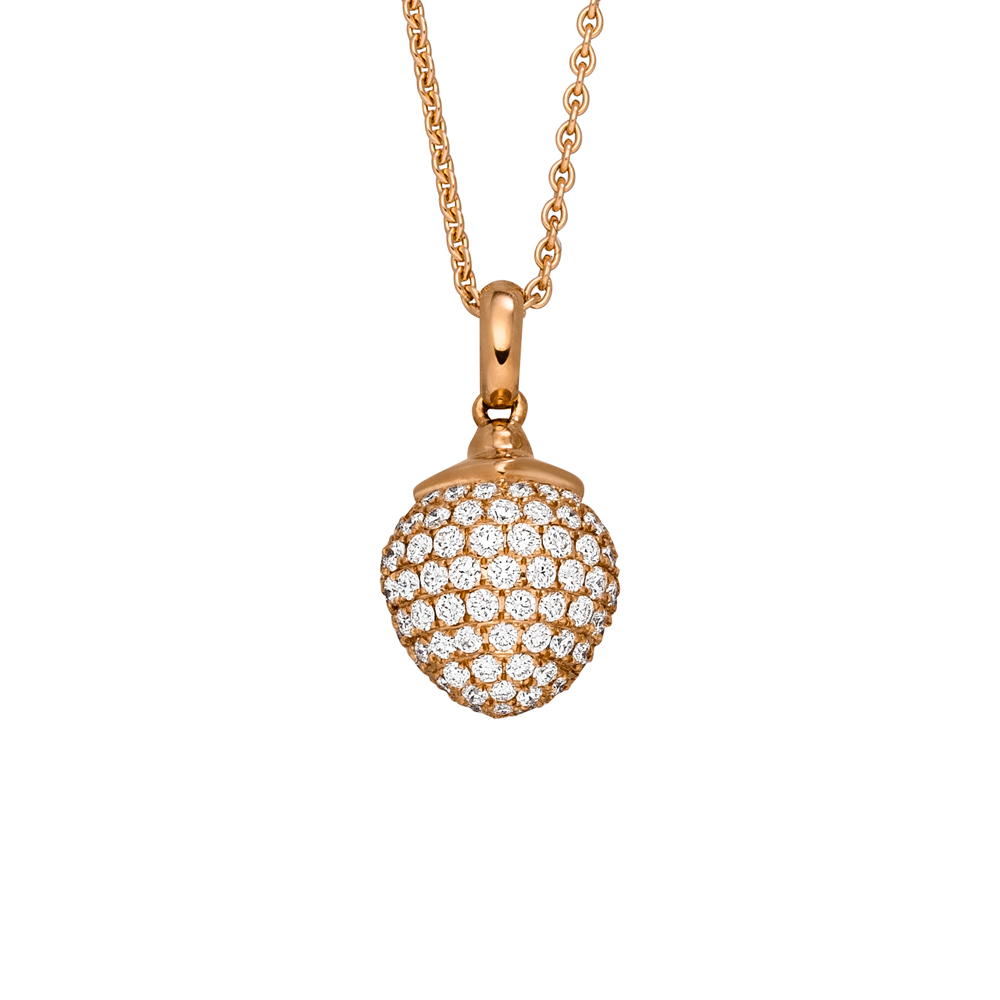 18 karaat rosegouden hanger met een roségouden bolletje pavé bezet met elk 118 briljant geslepen natuurlijke diamantjes samen 0.88 ct kleur H, zuiverheid: VVSI. De roségouden schakelketting is 45 cm lang en voorzien van een stevige karabijnsluiting