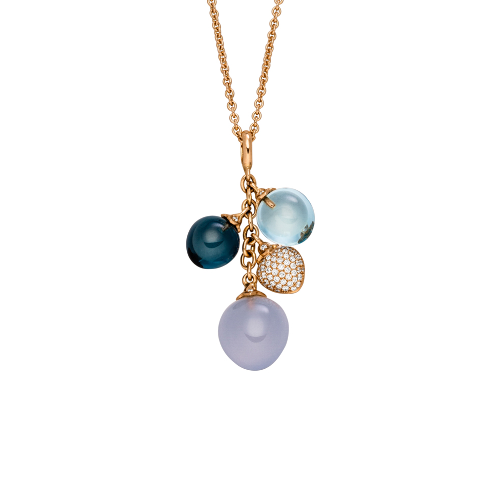 18 karaat rosegouden hangers waarbij een bolvormig geslepen blauwe chalcedoon, London blue topaas en blauwtopaas en een roségouden bolletje volledig pavé bezet met elk 57 briljant geslepen natuurlijke diamantjes samen 0.245 ct kleur H, zuiverheid: VVSI.