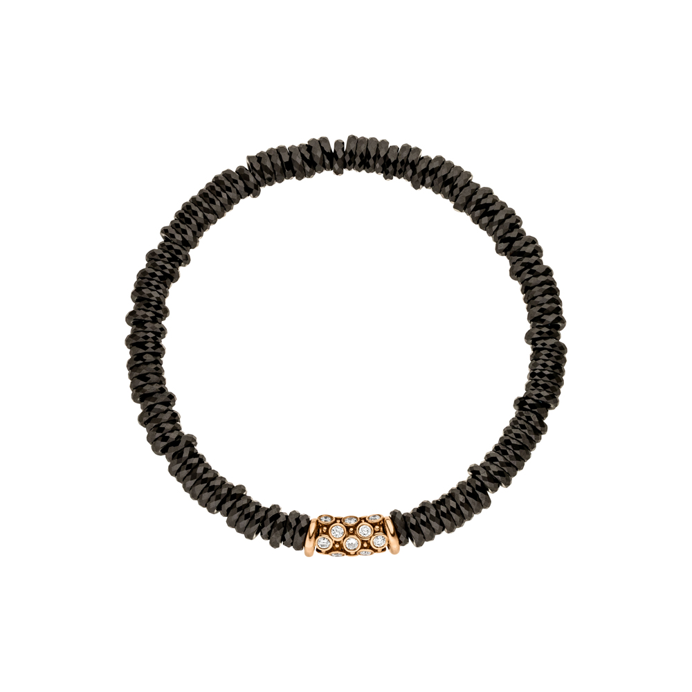 Flexibele armband gemaakt van keramische rondelles met een 14 karaat roségouden schakel rondom bezet met 19 natuurlijke briljant geslepen diamanten samen 0.57 ct. kleur H, zuiverheid SI