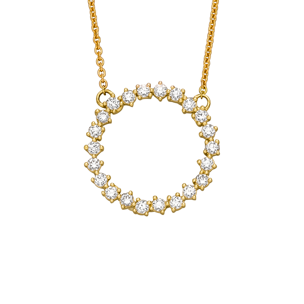 14 karaat geelgouden collier waaraan een cirkelvormige hanger met de rand volledig bezet met 22 natuurlijke, briljant geslepen, diamante samen 0.50 ct. kleur: H zuiverheid: SI. het collier heeft een kengte van 45 cm. met een karabijnslot.
