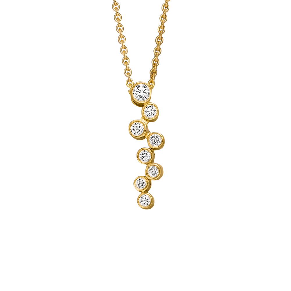 14 karaat geelgouden fijne hanger met 8 natuurlije briljant geslepen diamantjes elk in een gladde tonzetting gestrooid over de lengte van de hanger.
