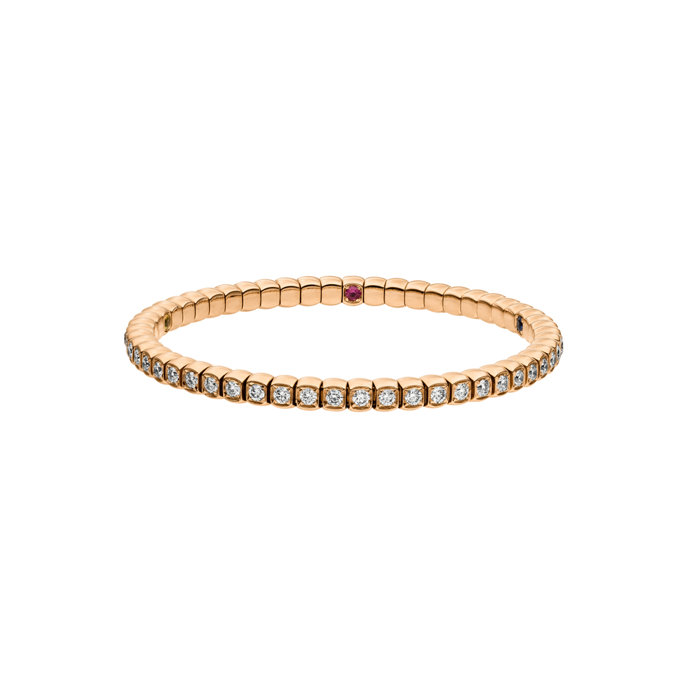18 karaat roségouden flexibele armband met aan een zijde 5 safieren in diverse kleuren een aan de andere zijde 54 natuurlijke briljant geslepen diamanten samen 2.70 ct. kleur H, zuiverheid SI. Doordat de armband volledig flexibel / uitrekbaar is kan deze zonder gebruik van een slot over de hand worden omgedaan. Tevens is de binnenzijde omkeerbaar tot buitenzijde en vise versa. 2 in 1