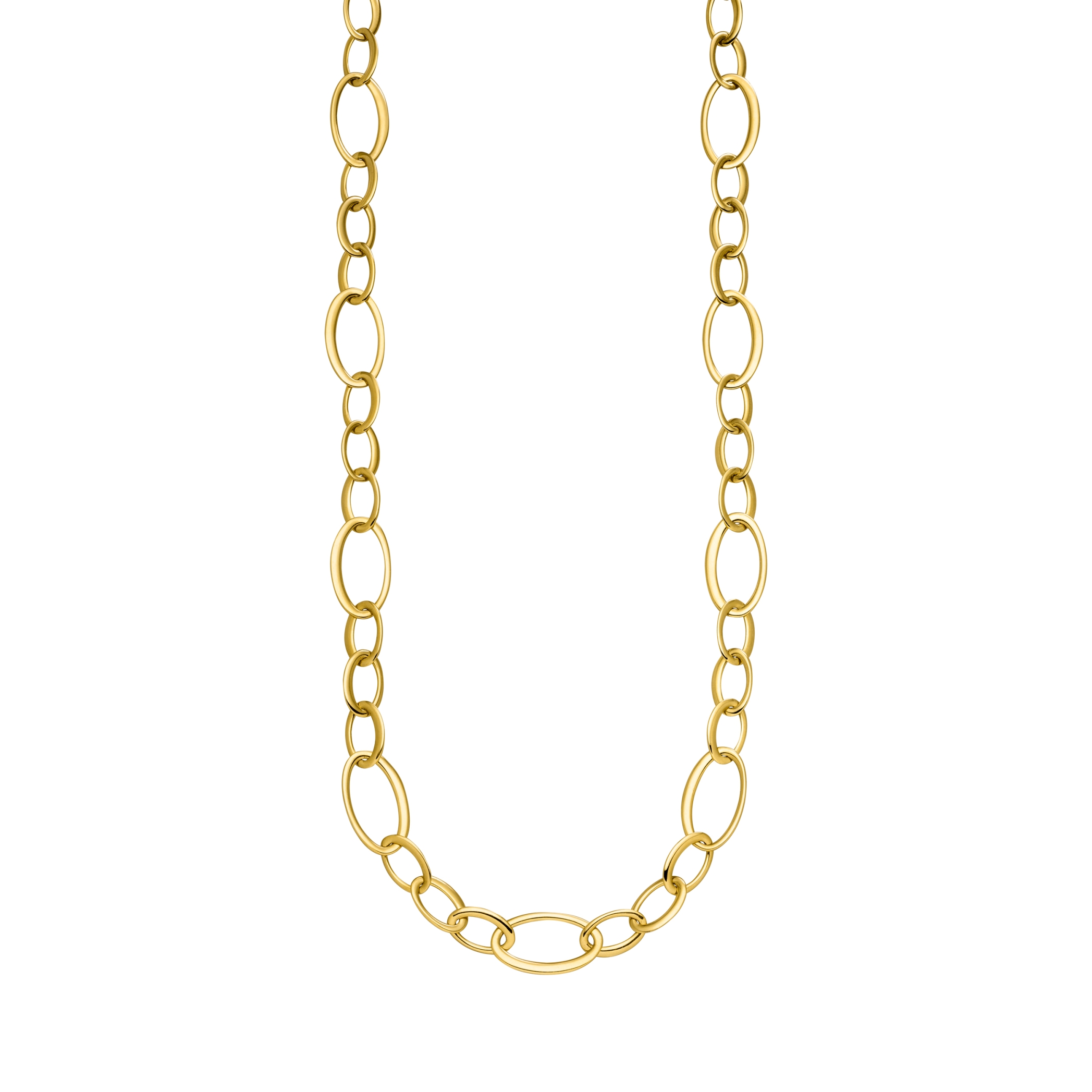 18 karaat geelgouden chanelcollier van 90 cm gemaakt van diverse maten ovale schakels met een aparte ovale karabijnsluiting. Dit collier kan op diverse manieren gedragen worden: