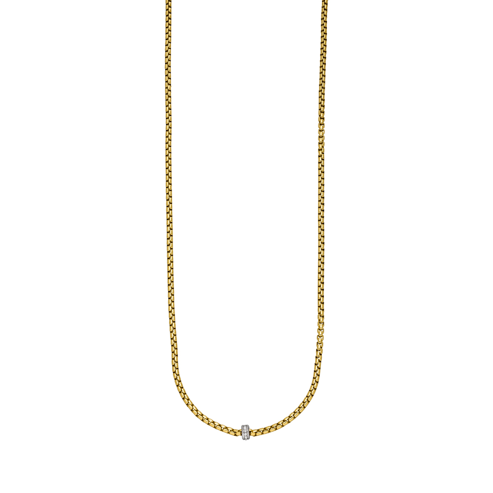 14  karaat geelgouden collier met een witgouden ronde rondelle bezet met 13 natuurlijke, briljant geslepen diamantjes samen 0.07 ct.kleur: H, zuiverheid: SI 45 cm. lang met een stevige karabijnsluiting