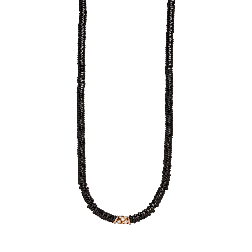 Flexibel collier, 45 cm lang, gemaakt van keramische rondelles met aan de voorzijde een 14 karaat roségouden schakel rondom bezet met 11 natuurlijke briljant geslepen diamanten samen 0.33 ct. kleur H, zuiverheid SI