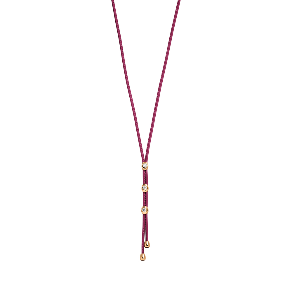 Elegant rood collier van Schaffrath waarop 3 18 karaat roségouden zettingen model Calla  elk bezet met een natuurlijke, briljant geslepen, diamant van 0.12 ct. kleur G, zuiverheid: VSI. 45 cm lang