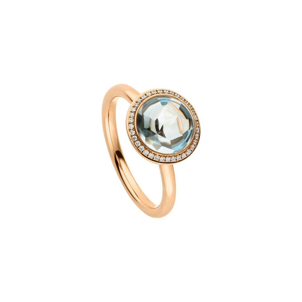 18 karaat roségouden ring, een strakke fijne scheen waarop een ronde zetting met een cabochon geslepen blauwe topaas van 2,69 ct. omringt door 36 briljant geslepen natuurlijke diamantjes samen 0.08 ct kleur: H, zuiverheid VVS