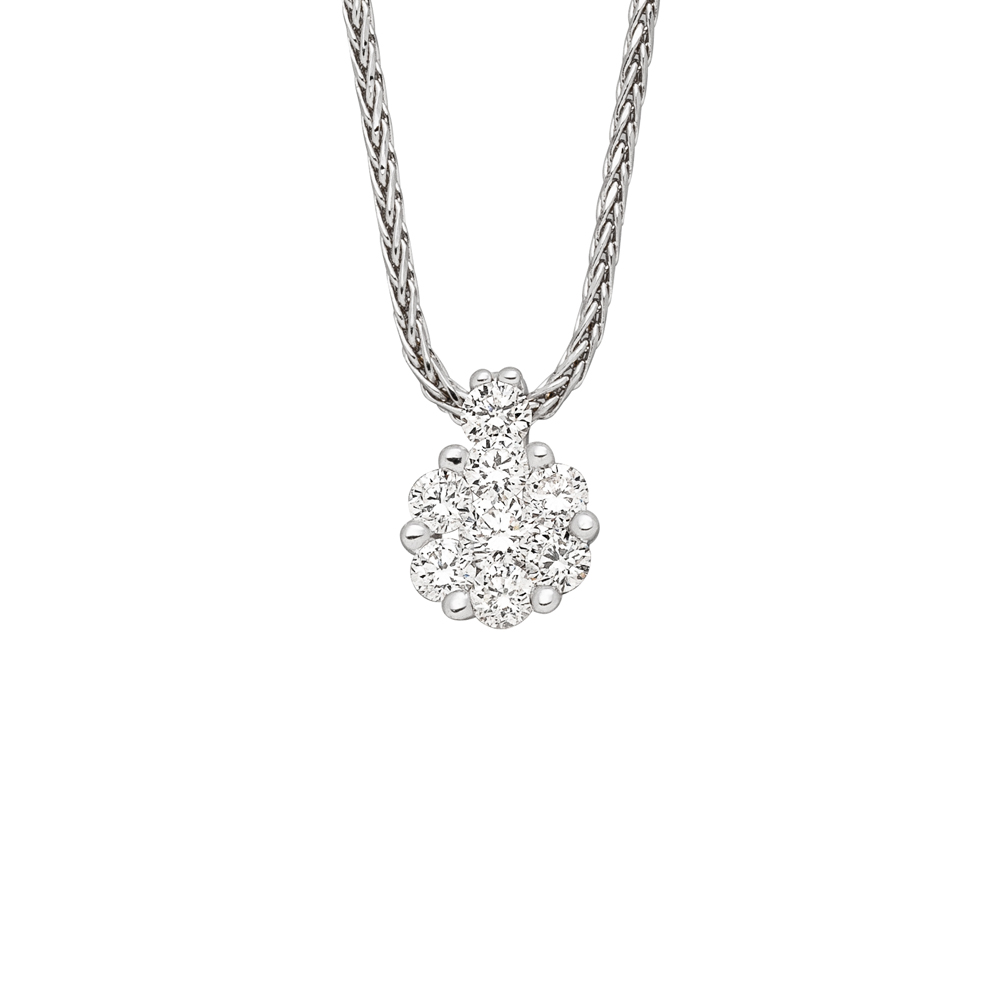 14 karaat witgouden schakelketting waaraan een entouragehanger bezet met 8 briljant geslepen natuurlijke diamanten samen 0.13 ct. kleur: H, zuiverheid: SI, De ketting is 45 cm. lang met een karabijnslot.