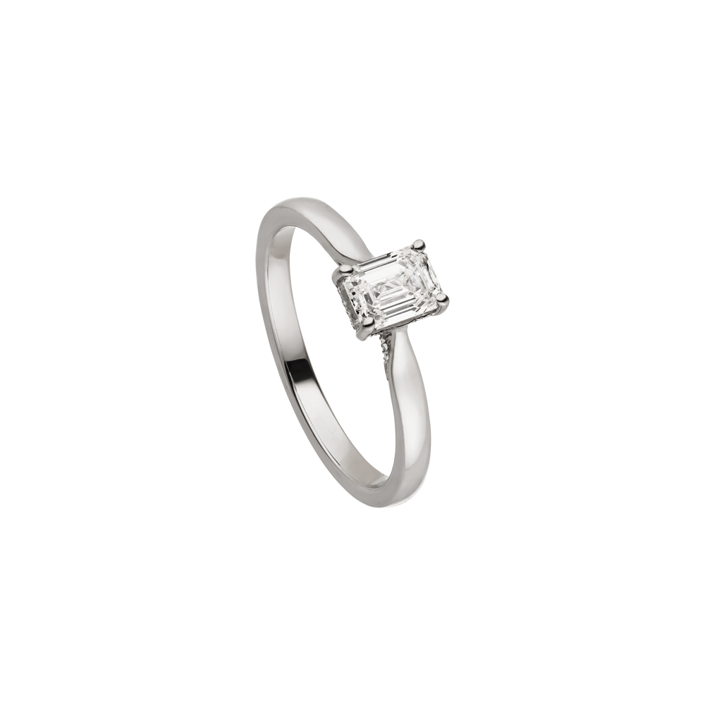 18 karaat witgouden solitairring bezet met een natuurlijke, emeraude geslepen diamant van 0.71 ct. kleur E, zuiverheid: VSI en 2 x 17 pavé gezette diamantjes aan de onderzijde van de zetting samen 0.05 ct. G-VSI